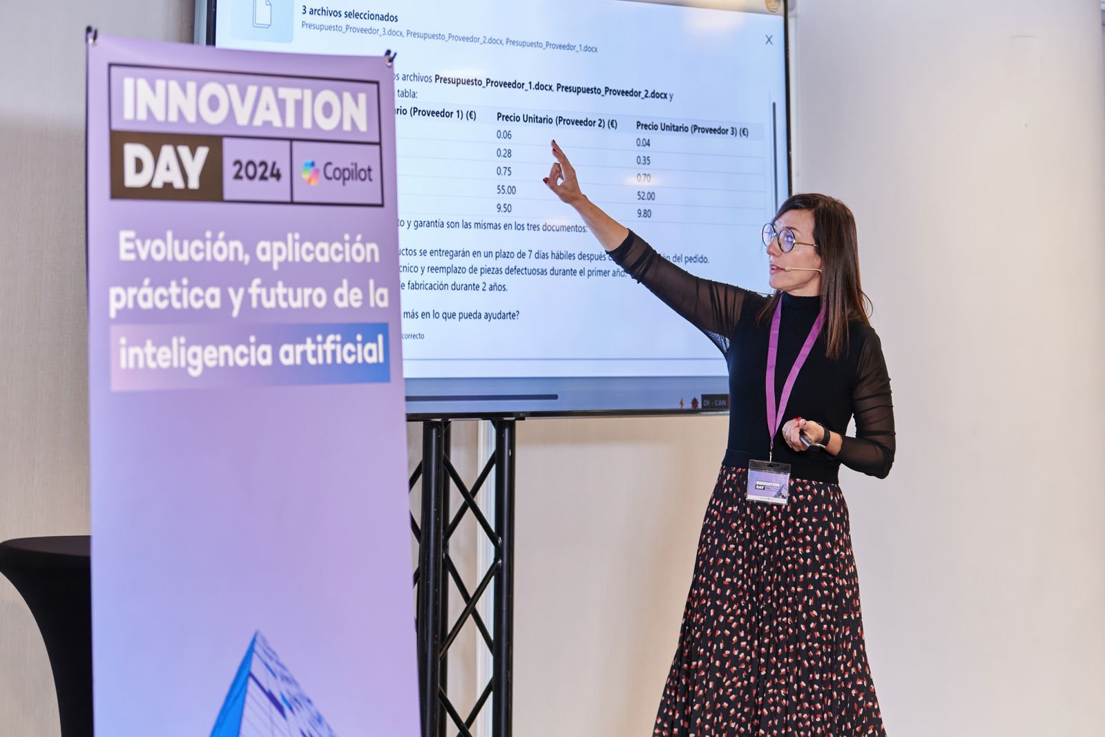 En el Innovation Day 2024, Magda Teruel, Partner Solution Architect en Microsoft, ofreció una ponencia centrada en cómo la inteligencia artificial está transformando los entornos laborales a través de Copilot, el asistente de IA generativa de Microsoft.